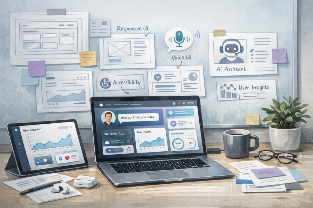 Среди ключевых направлений чаще всего называют AI-ассистированные интерфейсы, intent-driven UX, dynamic UI, мультимодальное взаимодействие, персонализацию, доступность и более тесную связь дизайна с бизнес-метриками.